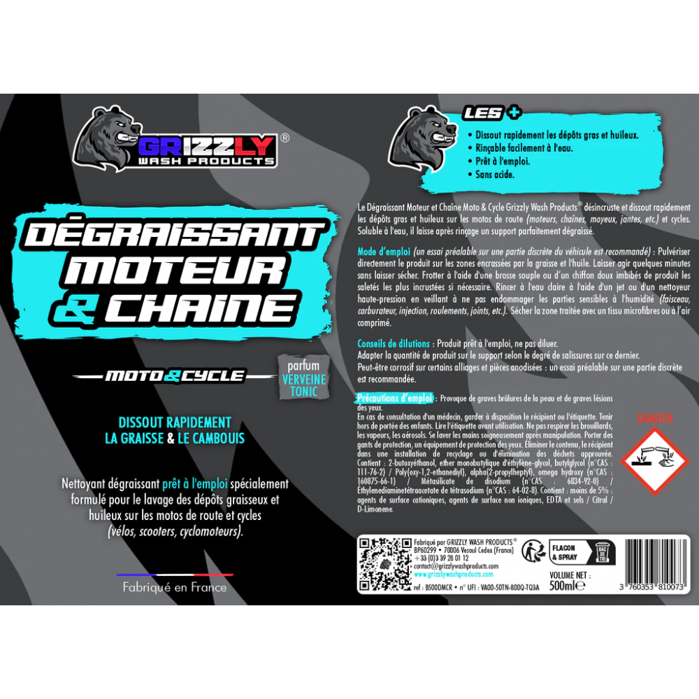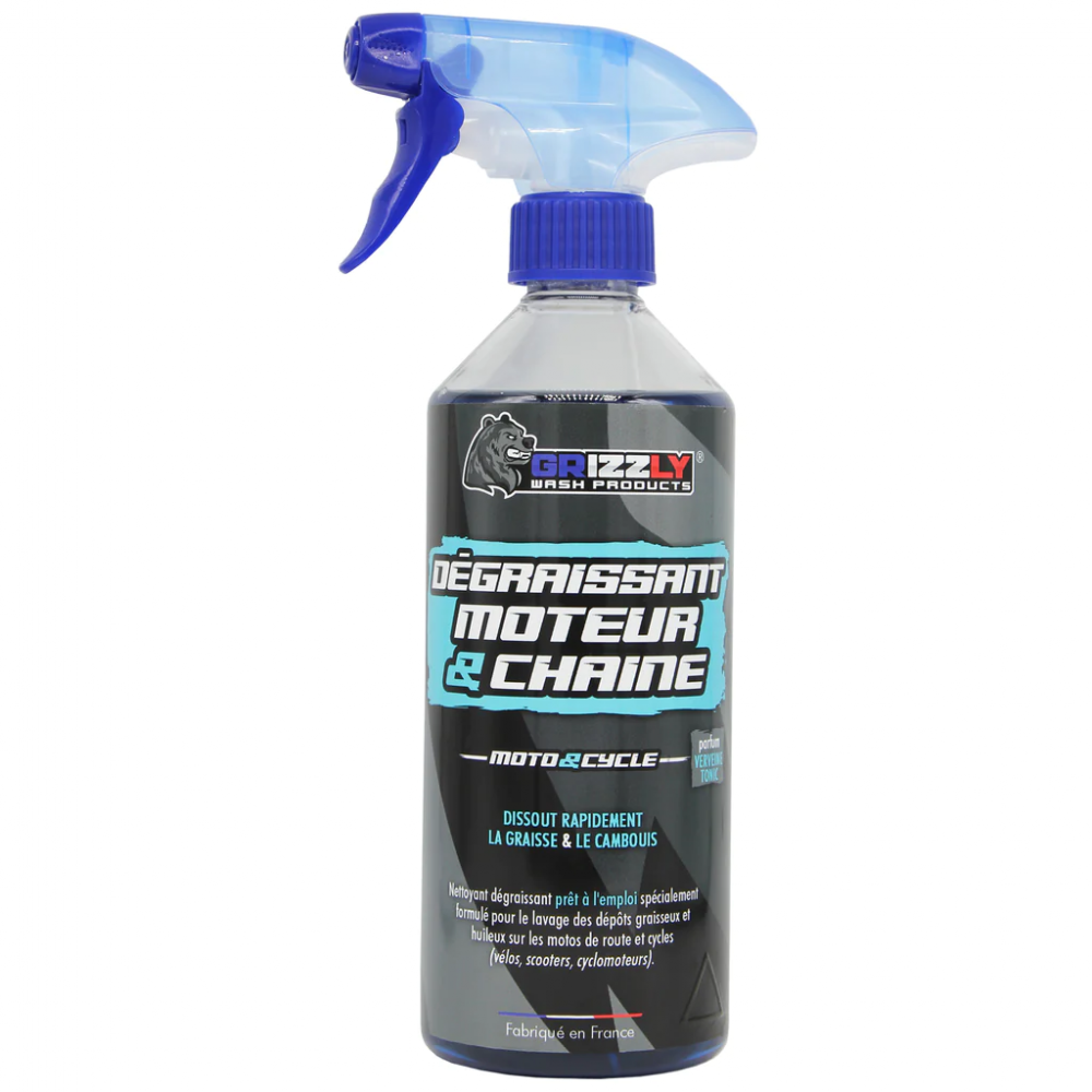 Le Dégraissant Moteur et Chaîne Moto & Cycle Grizzly Wash Products® désincruste et dissout rapidement les dépôts gras et huileux sur les motos de route (moteurs, chaînes, moyeux, jantes, etc.) et cycles.